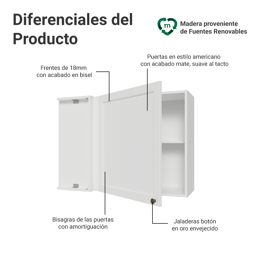 El acabado de alta resistencia de la estructura y las puertas es en blanco. Tiene una textura suave al tacto, aportando ligereza y sofisticación al ambiente. El detalle principal son los tiradores dorados envejecidos, hechos de metal resistente, que aportan personalidad y un encanto único. Otro diferencial está en el detalle biselado de las fachadas, que forma molduras elegantes y da profundidad al diseño, reflejando el estilo americano con un toque moderno.