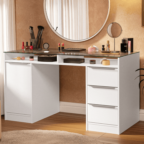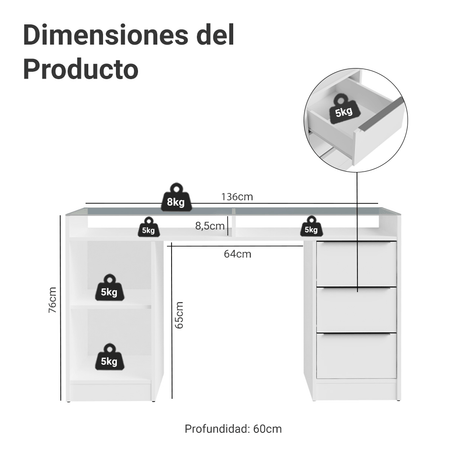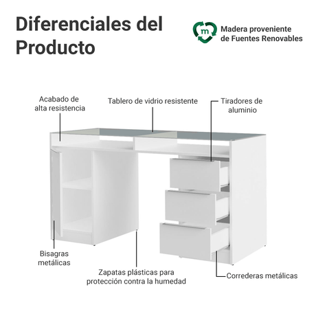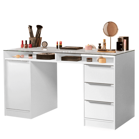 Escritorio Tocador 136cm 1 Puerta 3 Cajones Mesada Vidr...