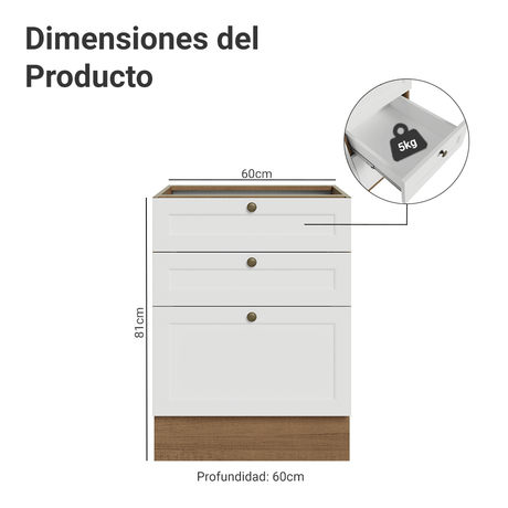 Bajo Mesada de Cocina 60 x 60 cm 3 Cajones (Sin Mesada)...