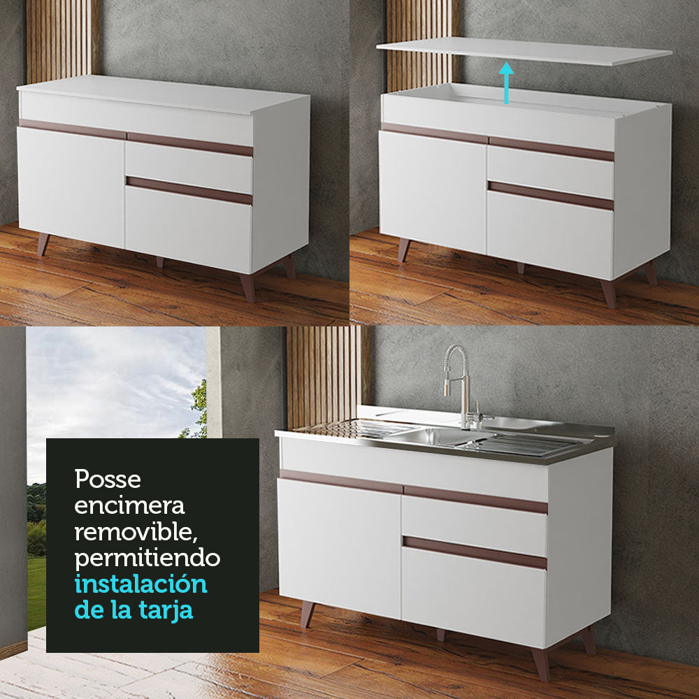 Un gran detalle son los pies de madera maciza con acabado marrón, que proporcionan belleza y mayor firmeza al mueble. Además, incluye un encimera en MDP, que se puede quitar para colocar una tarja de 120 cm de ancho por 52 cm de profundidad.