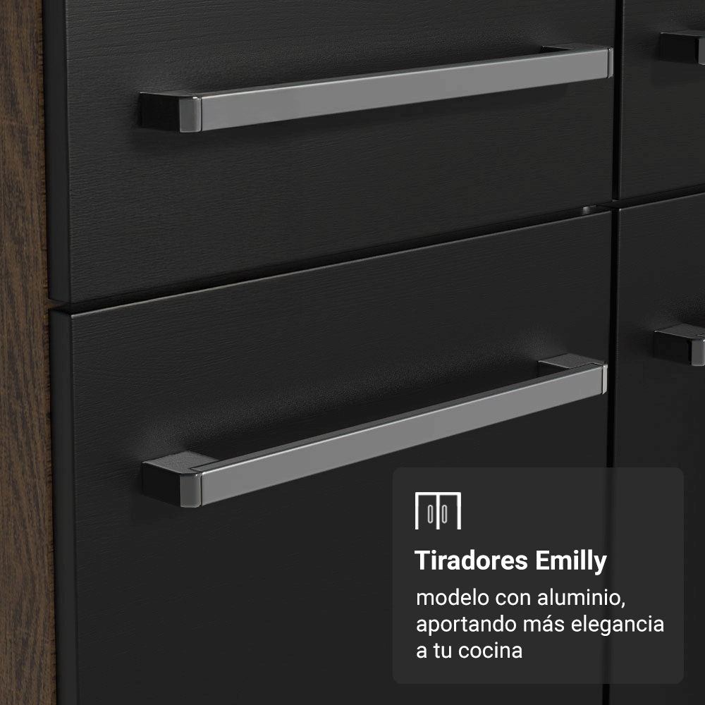 La calidad de los muebles es un diferencial. El mueble base cuenta con patas regulables, tiradores de aluminio, además de correderas y bisagras metálicas.