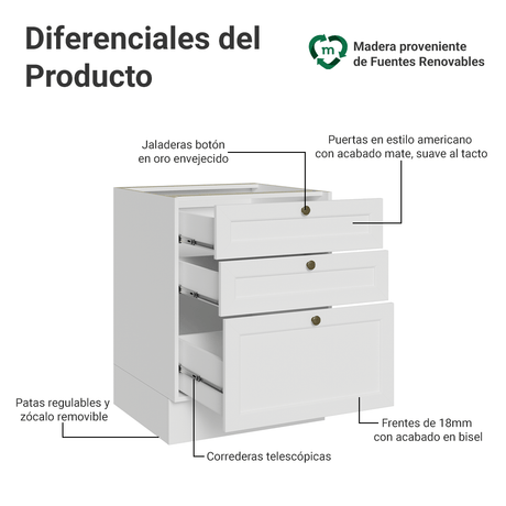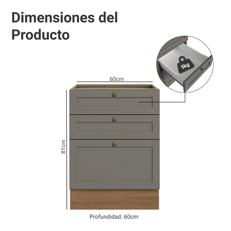 Bajo Mesada de Cocina 60 x 60 cm 3 Cajones (Sin Mesada)...