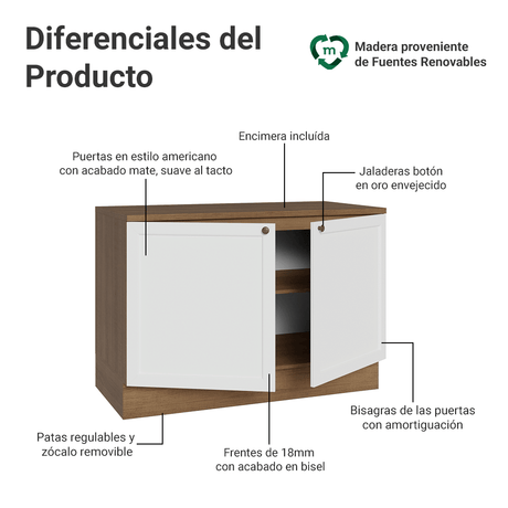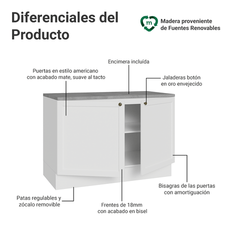 Bajo Mesada de Cocina 120 cm 2 Puertas Blanco Mesada Ma...