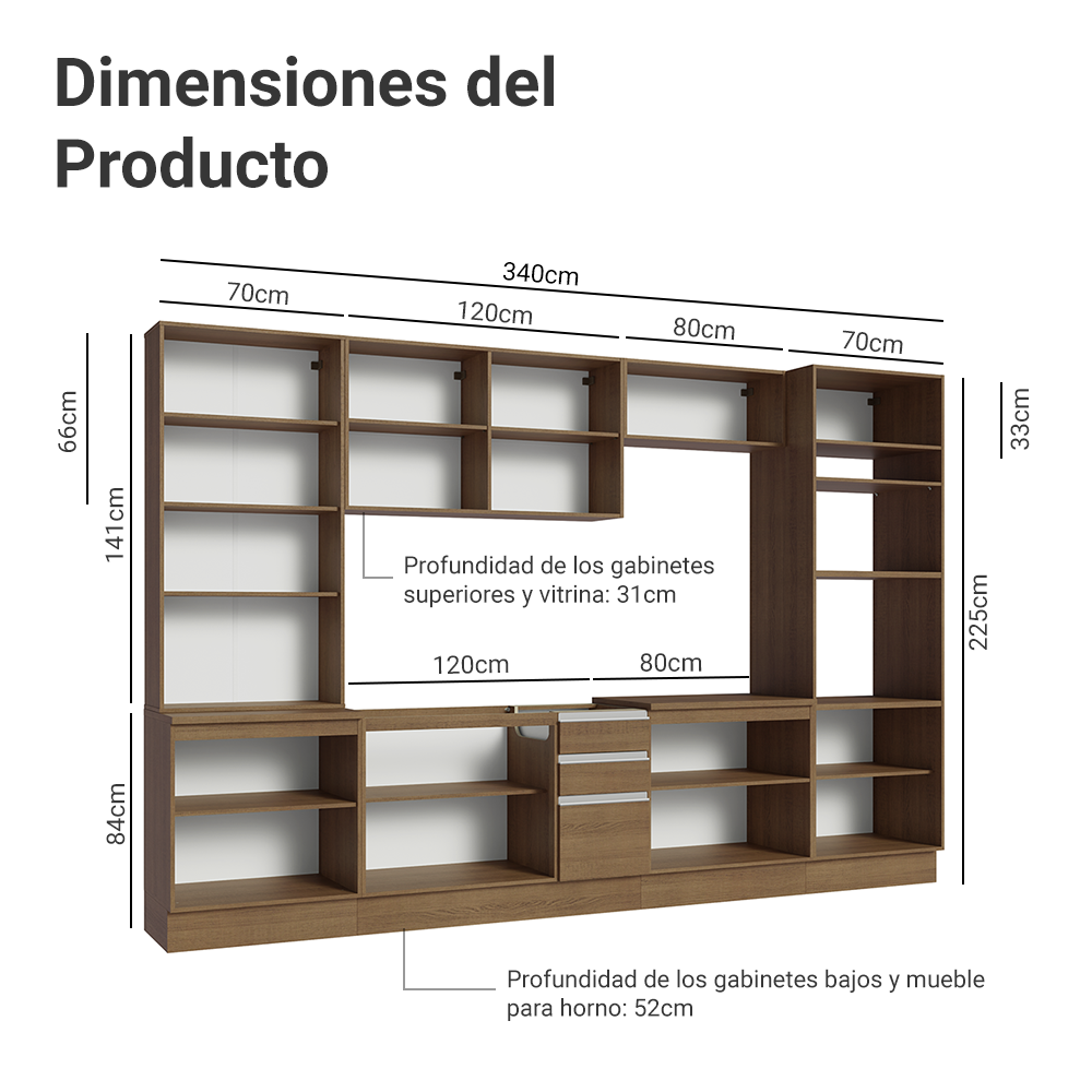 52 cm de profundidad en los gabinetes bajos y la torre, y 31 cm en los aéreos