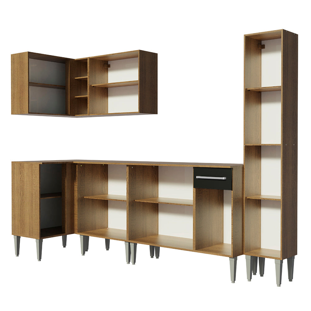 La Cocina Esquinera Emilly Water de Madesa está fabricada con materiales de alta calidad, como tiradores con detalle en aluminio y resistentes correderas y bisagras metálicas. Incluye tres bajo mesada, dos alacenas aéreas, una vinera acoplada y una despensa, todos con excelente aprovechamiento del espacio. Así, es más fácil organizar utensilios, vajilla y electrodomésticos.