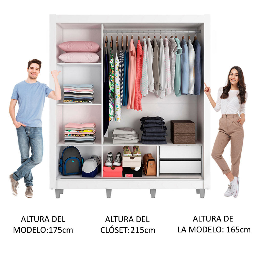 Hay dos cajones internos con correderas metálicas, muchos nichos que facilitan la organización de ropa, zapatos y complementos. El tubo perchero es muy resistente y tiene espacio para ropa larga.
