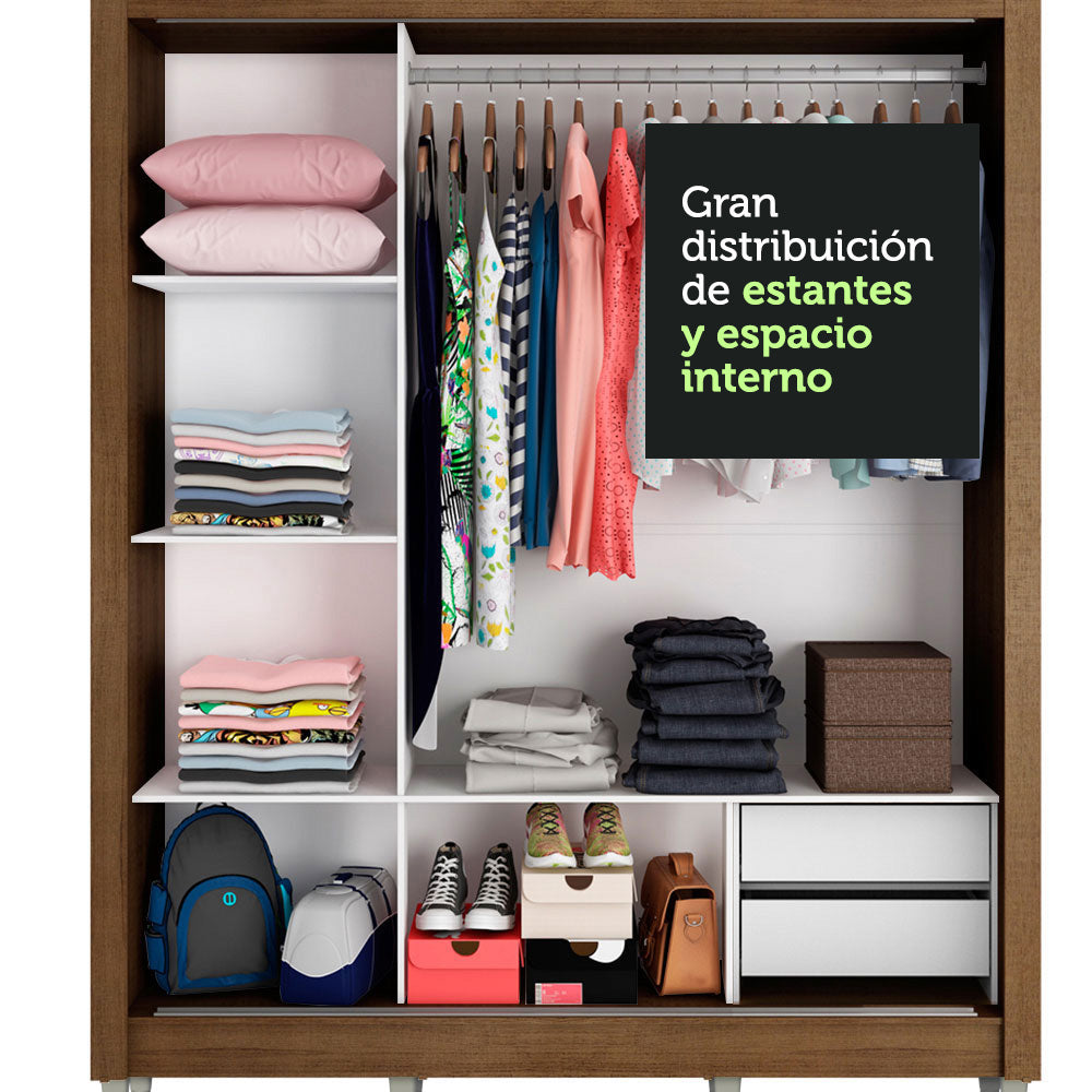 Hay dos cajones internos con correderas metálicas, muchos nichos que facilitan la organización de ropa, zapatos y complementos. El tubo perchero es muy resistente y tiene espacio para ropa larga.