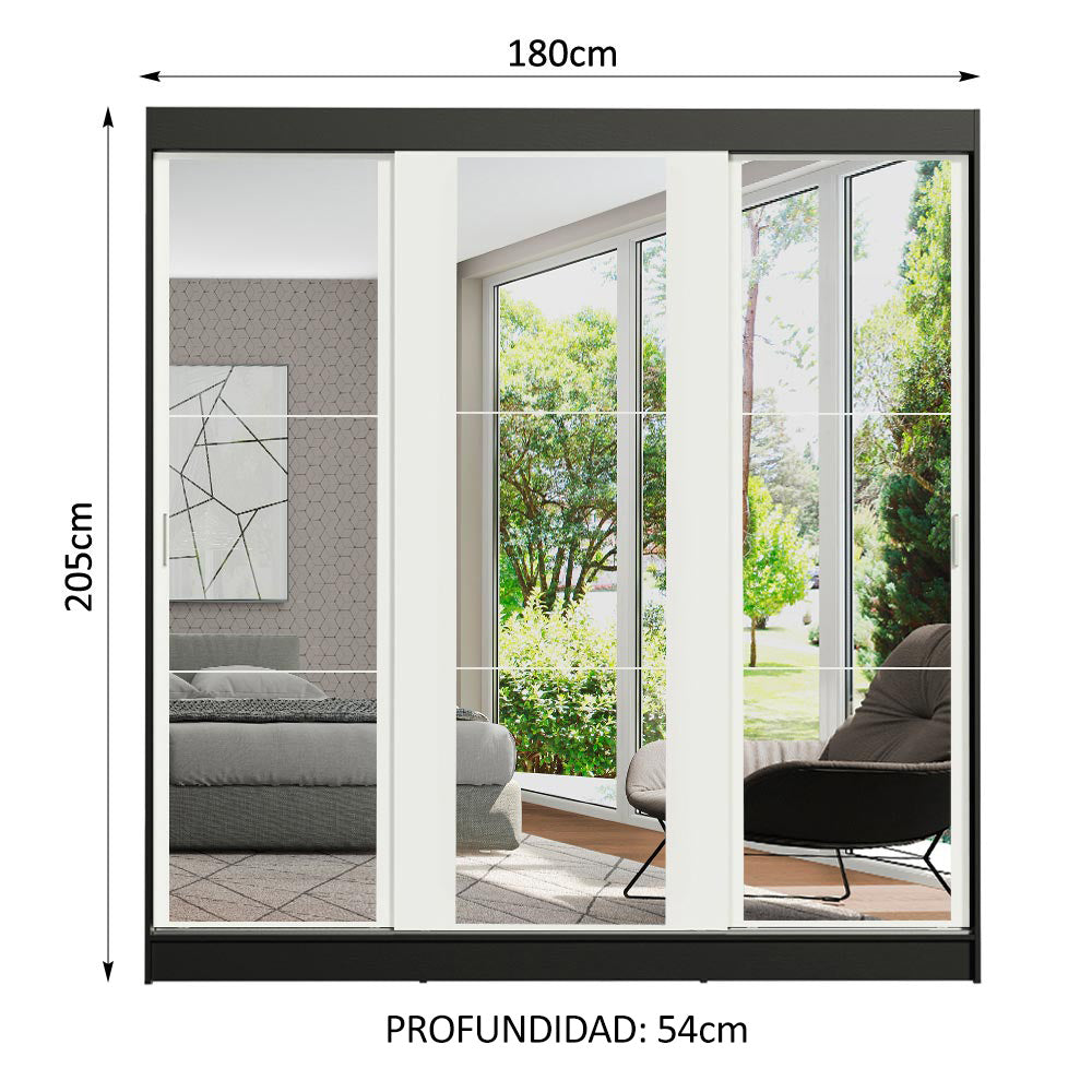 Placard Matrimonial Reno con 3 Puertas Corredizas de Espejo Negro/Blanco