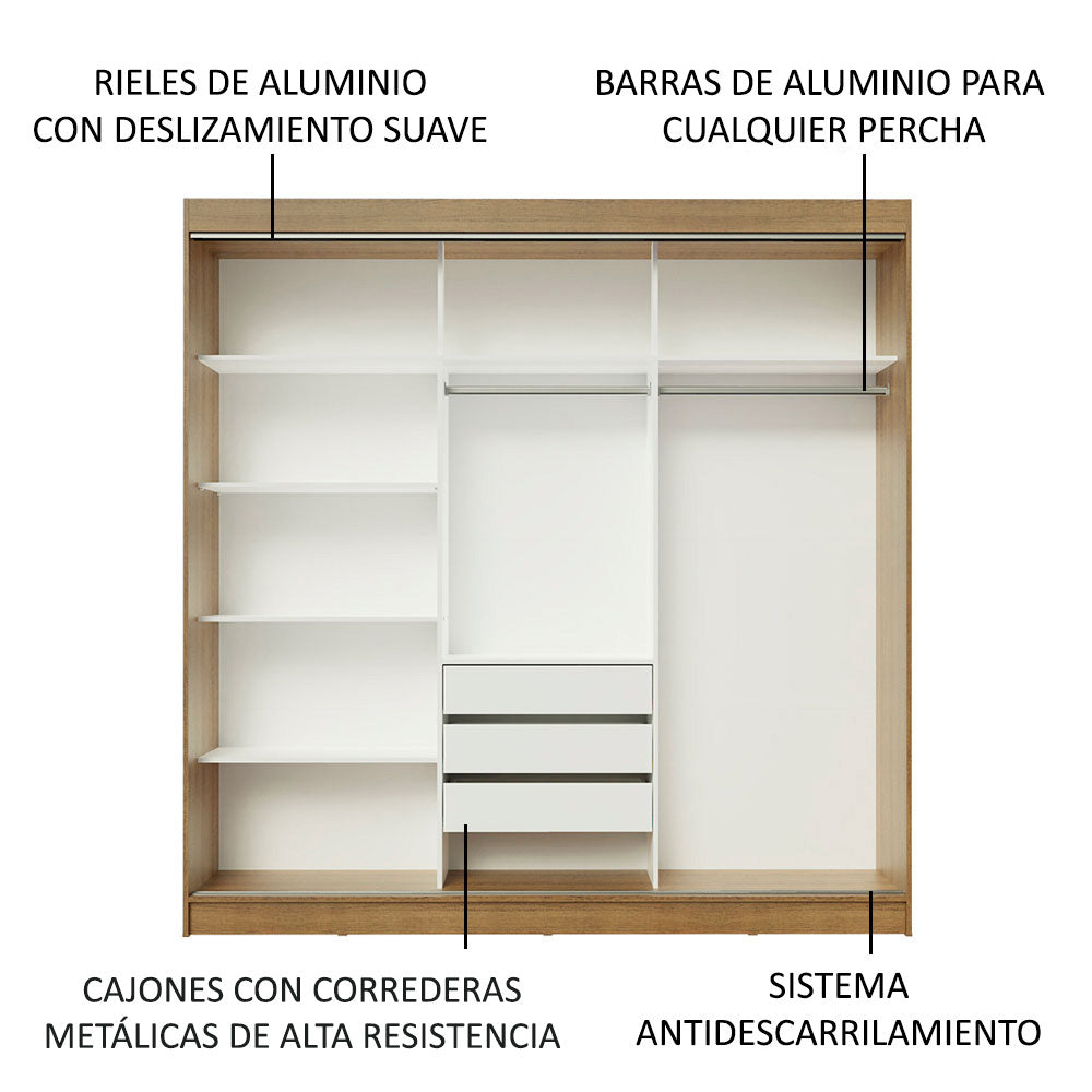 - Tres (3) puertas corredizas con sistema antideslizamiento, todas con espejos