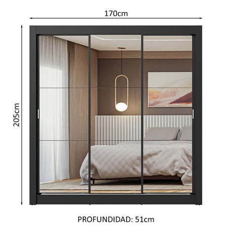 Placard Matrimonial 3 Puertas Corredizas con Espejo Neg...