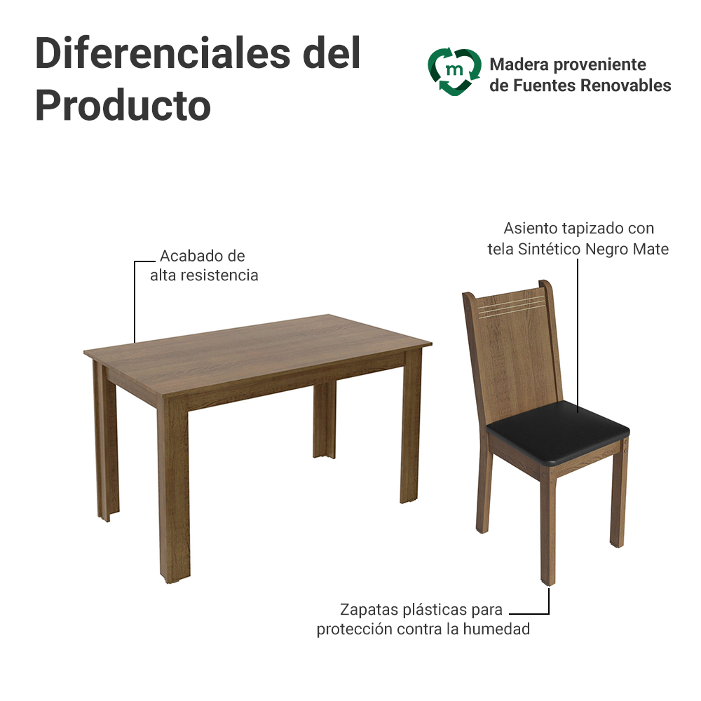 El Conjunto de Comedor Norah combina el tono amaderado marrón de la madera con el tapizado negro de las sillas, creando un ambiente sofisticado y acogedor para tu hogar.