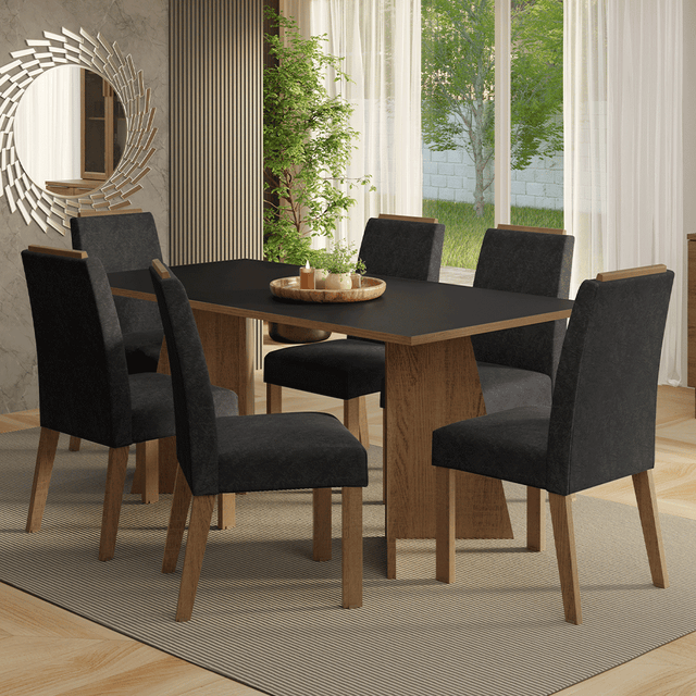 La estructura de la mesa tiene un acabado marrón, el tablero es negro y las sillas están tapizadas en tela Suede Oxford. La combinación de tonos oscuros y detalles en madera crea un ambiente moderno, haciendo del conjunto la pieza ideal para unir belleza, comodidad y practicidad en tu comedor.