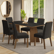 La estructura de la mesa tiene un acabado marrón, el tablero es negro y las sillas están tapizadas en tela Suede Oxford. La combinación de tonos oscuros con detalles en madera crea un ambiente sofisticado y acogedor, haciendo del conjunto ideal para unir belleza, comodidad y practicidad en tu comedor.