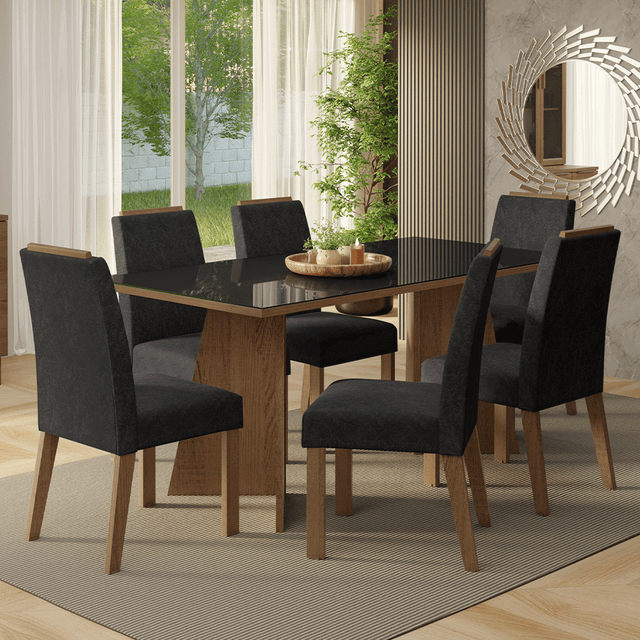 Con seis sillas tapizadas en tela Oxford Suede, cada detalle, incluido el acabado de madera en la parte superior, ofrece elegancia. La mesa, con base trapezoidal, tablero negro y vidrio incoloro superpuesto, proporciona estabilidad y amplio espacio para acomodar a toda la familia, haciendo cada comida aún más placentera.