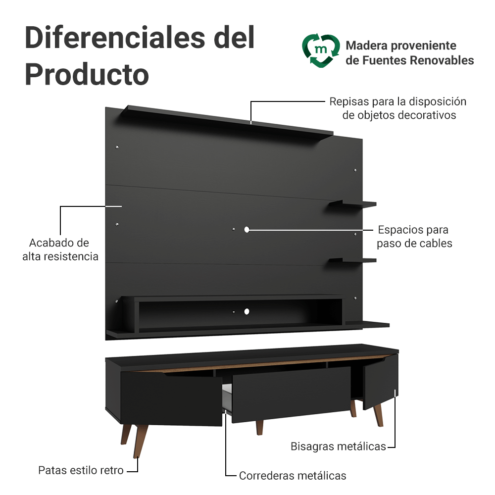 El Panel de TV admite televisores de hasta 60 pulgadas y cuenta con espacio para el paso de cables, lo que ayuda a mantener todo organizado. El Mueble para TV ofrece excelente espacio interno, con dos puertas laterales y un cajón central con correderas metálicas, ideales para guardar objetos de forma práctica.