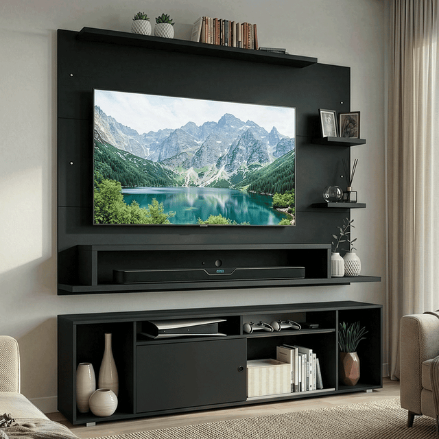 El Panel de TV admite televisores de hasta 60 pulgadas y cuenta con espacio para el paso de cables y alambres, lo que ayuda a mantener todo organizado y con un aspecto más limpio. El Mueble para TV tiene nichos de diferentes tamaños, con espacios que facilitan la organización y ofrecen un mejor aprovechamiento del espacio.