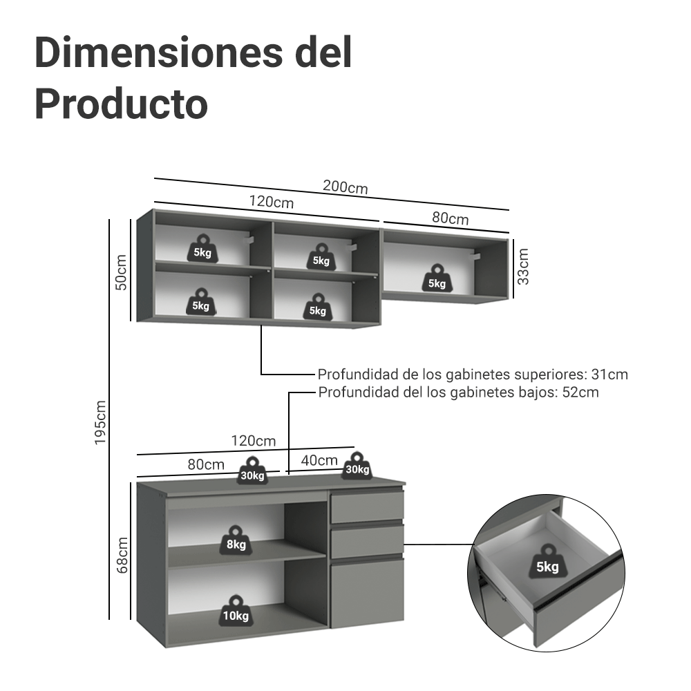 - 52 cm de fondo en las mesadas y 31 cm en los muebles altos