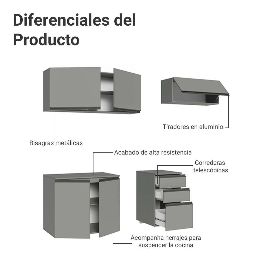 Fabricado con materiales de alta calidad, incluye bisagras metálicas duraderas, rieles telescópicos para apertura total del cajón y manijas de aluminio.