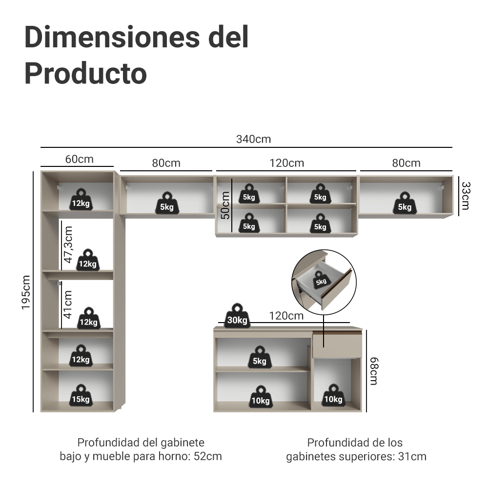 - 52 cm de profundidad en los muebles/torre para horno y 31 cm en los aéreos