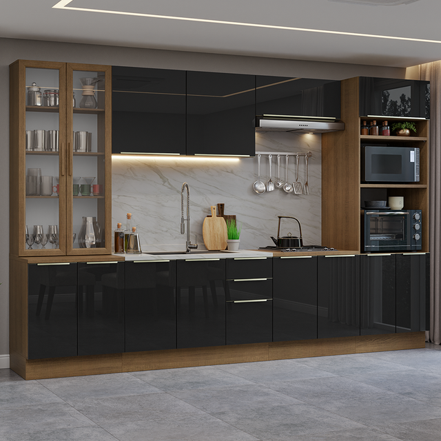 Fabricada con un estándar de calidad superior, esta cocina cuenta con vidrio incoloro superpuesto en los frentes y puertas. Además, los tiradores son de aluminio, los cajones tienen apertura total y las puertas poseen amortiguación para un cierre suave.