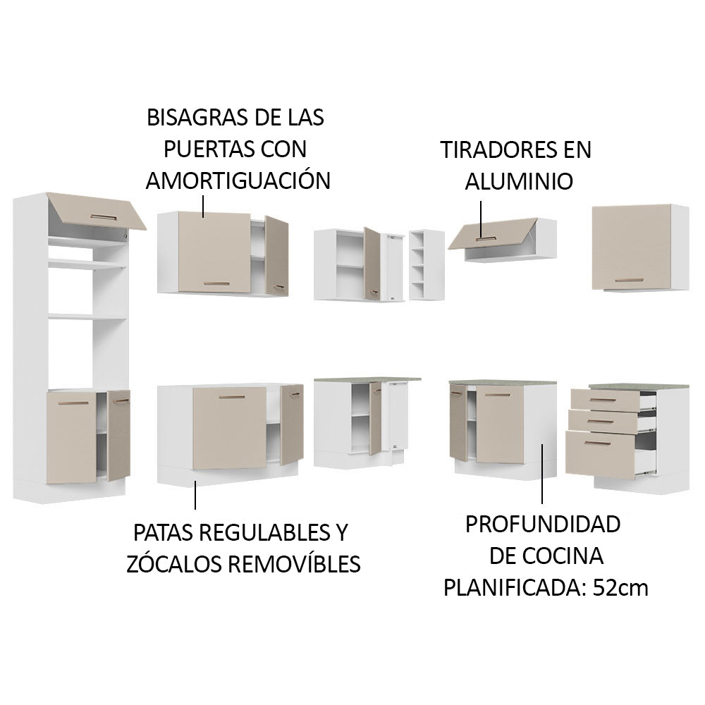 El Mueble para Hornos, ofrece espacio para horno y microondas, y permite la instalación de un horno empotrado, y la Mesada principal, es apta para bachas de 120 cm x 52 cm. Las Mesadas de otros muebles pueden cortarse para instalar una placa de cocción. La cocina también cuenta con patas regulables de PVC y un zócalo desmontable de MDP, facilitando la limpieza.