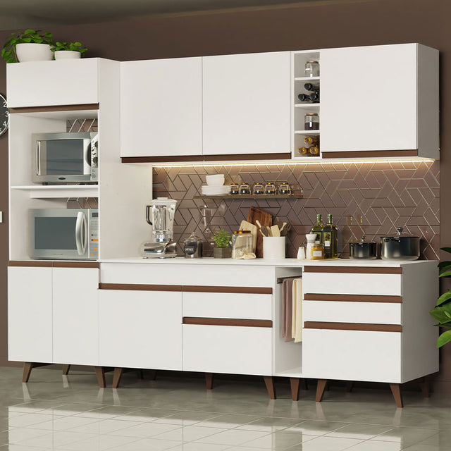 El espacio disponible es excelente, ideal para la organización de vajilla, ollas y utensilios. Además, el mueble para horno ofrece espacio para horno y microondas y permite la instalación de un horno empotrado.