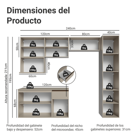 Combo completo de Cocina 240 cm Flotante Crema Nice Mad...