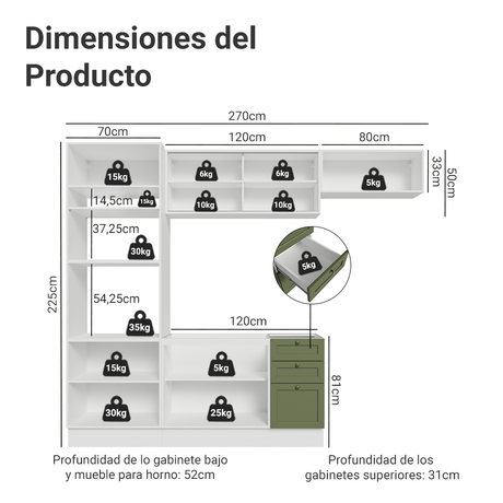 9x de $120.964,00 sin interés16% OFF$1.088.67600$1.306.70900Precio unitario /AgotadoCombo de Cocina 270 cm Vik Blanco/Verde 03
