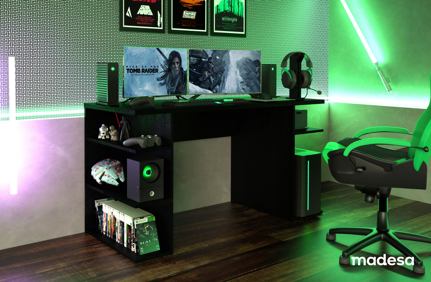 Este Escritorio tiene espacio para organizarlo todo, espacio para el teclado, el monitor, los altavoces y lo que prefieras. En la parte inferior hay varios estantes, perfectos para el CPU, los juegos, los mandos y la consola, no importa si juegas con la PC o con un videojuego.