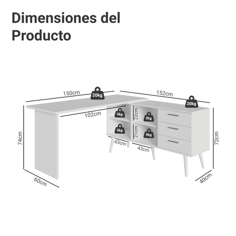 Escritorio Mesa de Estudos esquinero 3 Cajones Blanco L...