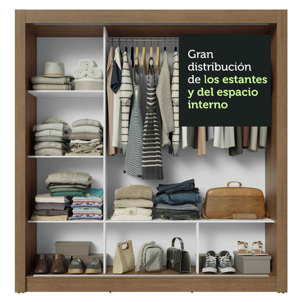 El uso interno es ideal para una pareja. Los diversos nichos permiten una óptima organización de ropas, accesorios, zapatos y lo que prefiera. Además, el perchero metálico es muy resistente de gran tamaño y aporta espacio para ropas largas.