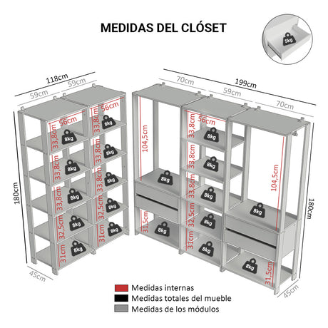 9x de $99.702,22 sin interés$897.31999Precio unitario /AgotadoPlacard Matrimonial 180 cm Sin Puertas 4 Cajones Venus ...