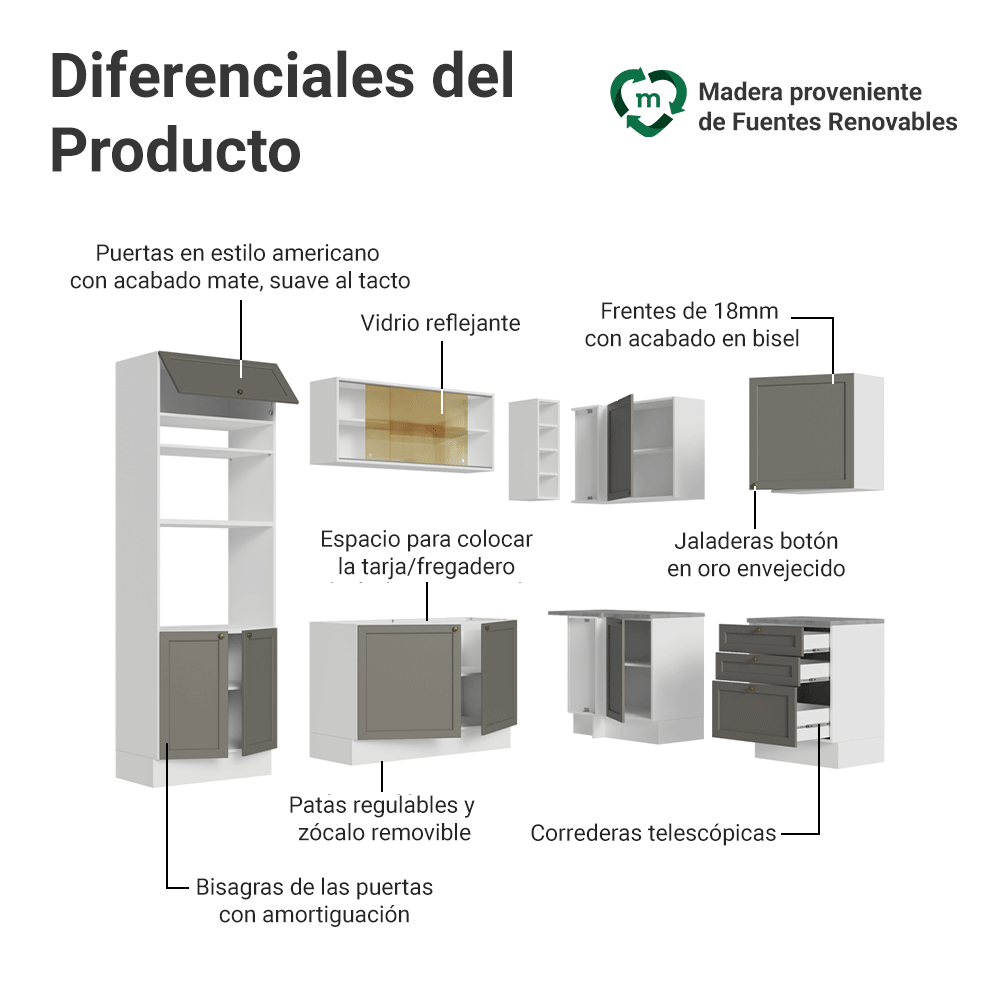 El acabado de alta resistencia de la estructura es en Blanco, las frentes en Gris y tiene una textura suave al tacto. El detalle destacado son los tiradores en oro envejecido, hechos de metal resistente, que aportan personalidad y un encanto único. Otro diferencial está en el detalle biselado de las frentes, que forma molduras elegantes y le da profundidad al diseño.