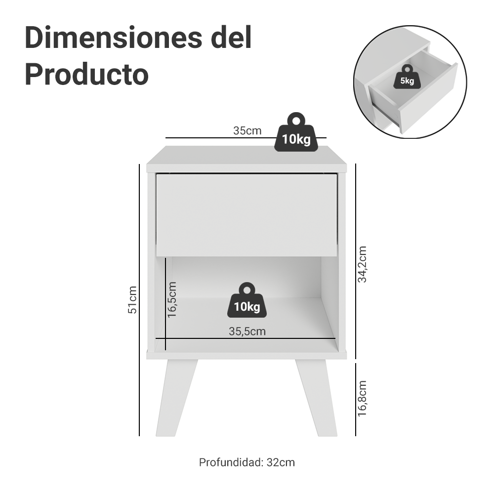 Posee un cajón con correderas metálicas y un nicho abierto, con fácil acceso a pequeños objetos, trayendo más practicidad.