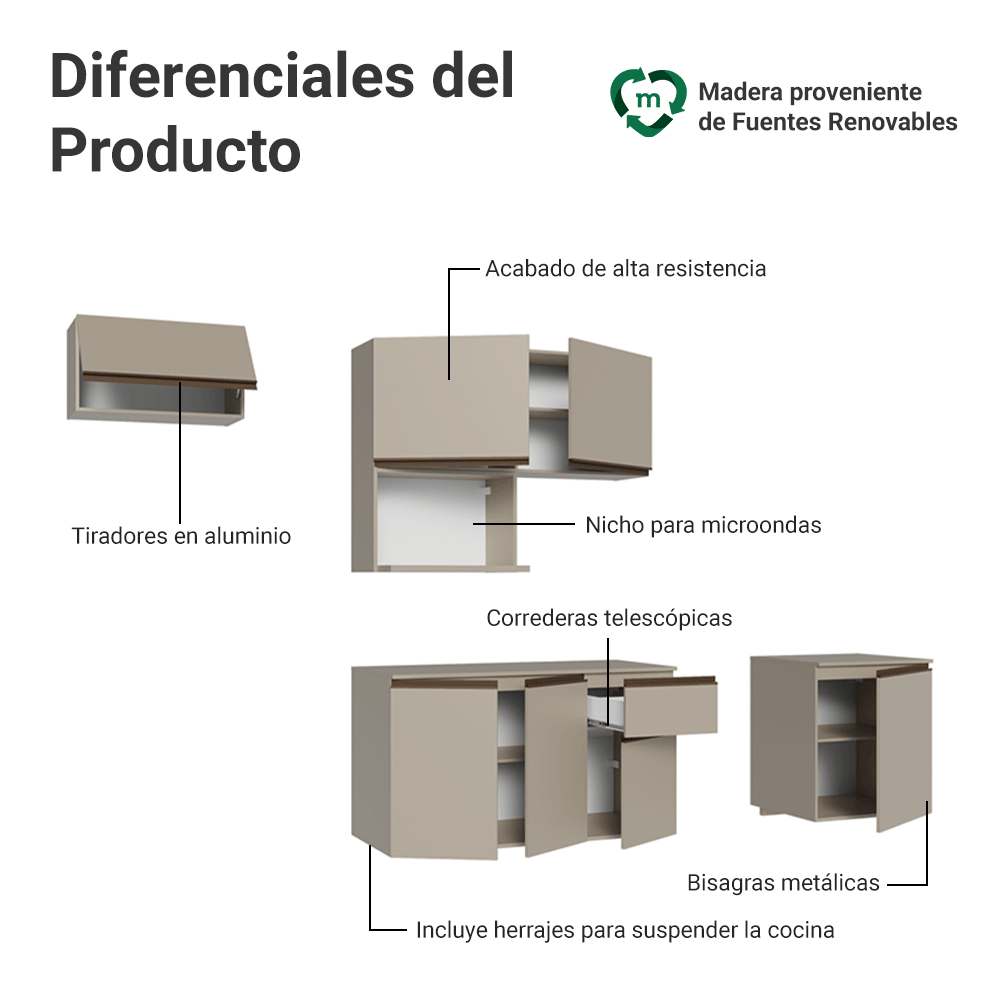 El Bajo Mesada cuenta con bisagras metálicas en las puertas y tiradores en perfil de aluminio, discretos y resistentes. Los cajones tienen correderas que permiten apertura total. La mesada es removible, posibilitando la instalación de una tarja de acero inoxidable y el acabado es de alta resistencia.