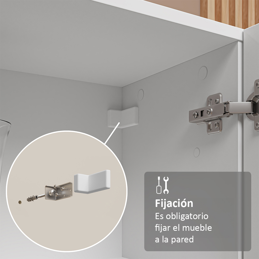 Las dos puertas de vidrio añaden un toque de sofisticación, permitiendo organizar y visualizar tu vajilla, copas y demás elementos decorativos. Con varios estantes, el interior ofrece un excelente aprovechamiento del espacio, ayudando a mantener todo en orden.