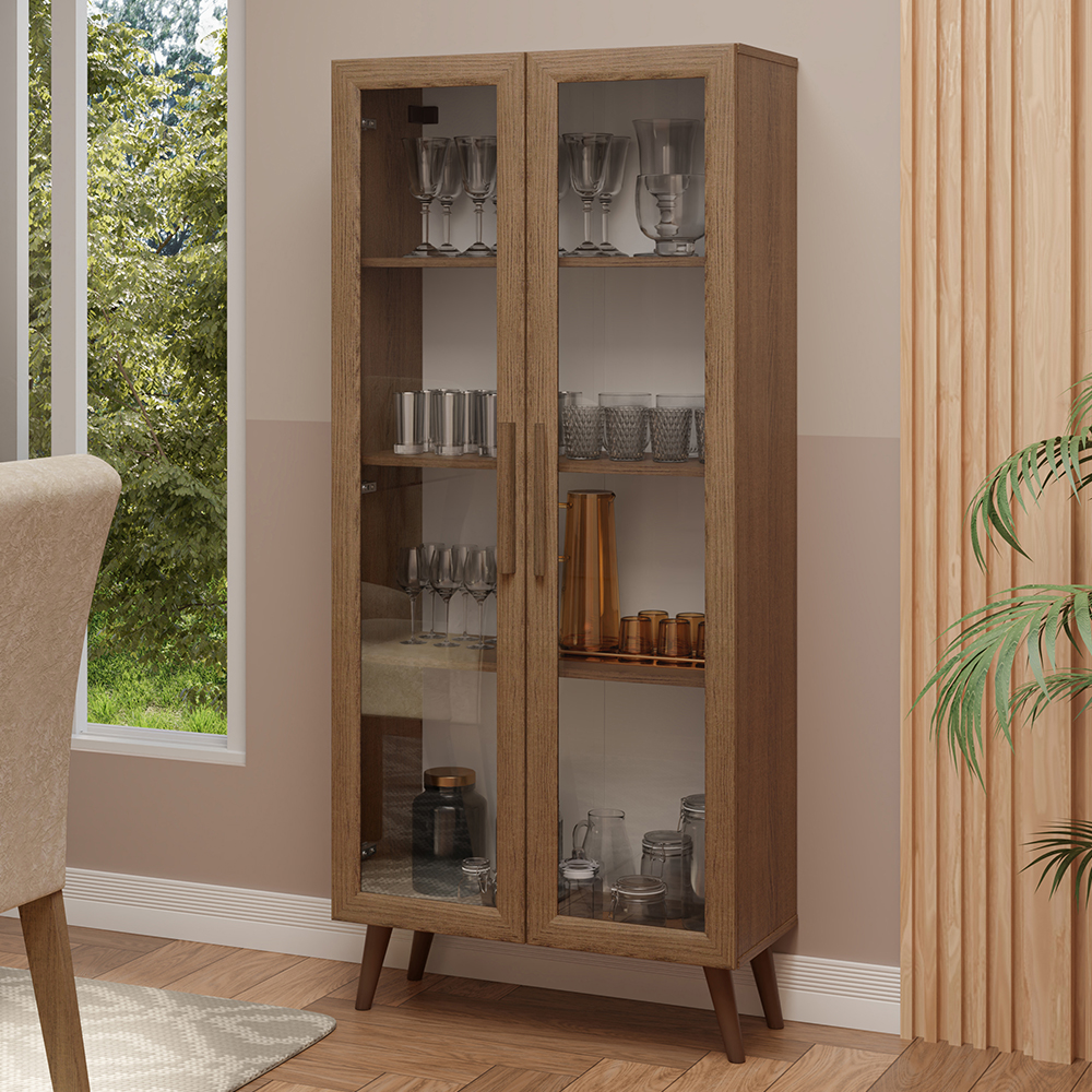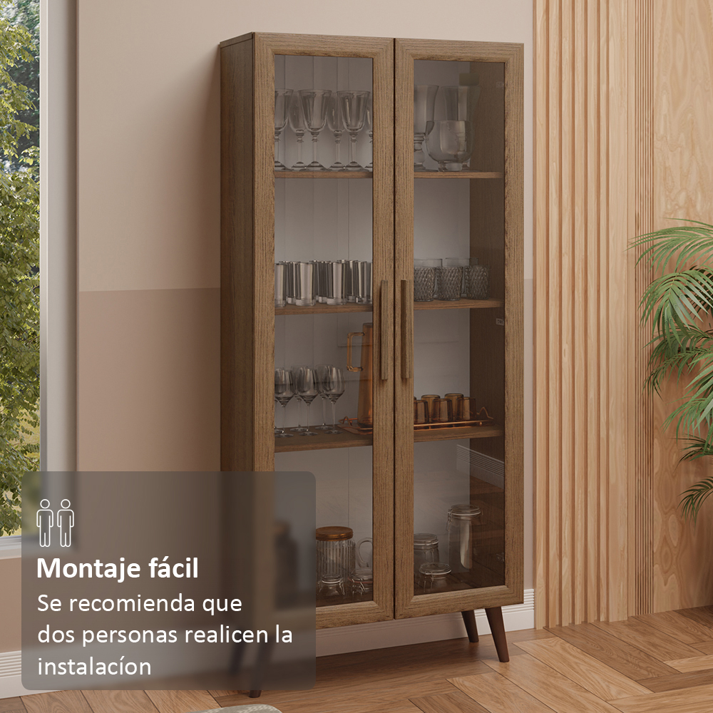 Las dos puertas de vidrio añaden un toque de sofisticación, permitiendo organizar y visualizar tu vajilla, copas y demás elementos decorativos. Con varios estantes, el interior ofrece un excelente aprovechamiento del espacio, ayudando a mantener todo en orden.