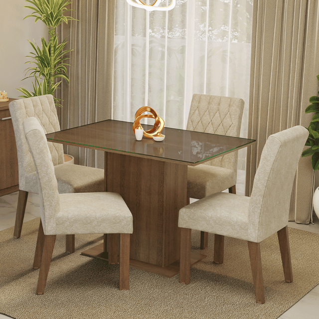 Con acabado amaderado Marrón y sillas tapizadas en tejido Imperial, aporta sofisticación y equilibrio al ambiente. El tono neutro realza la decoración y se adapta fácilmente a diferentes estilos.