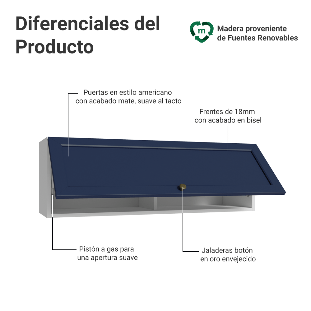 El blanco y azul refuerza la elegante apariencia de la línea Vik. Su textura suave al tacto aporta sofisticación al ambiente. Destaca la manija con punta de oro antiguo, hecha de metal resistente, que le aporta personalidad y un encanto único. Otra característica distintiva es el detalle biselado en los frentes, que forma molduras, reflejando el estilo americano con un toque moderno.