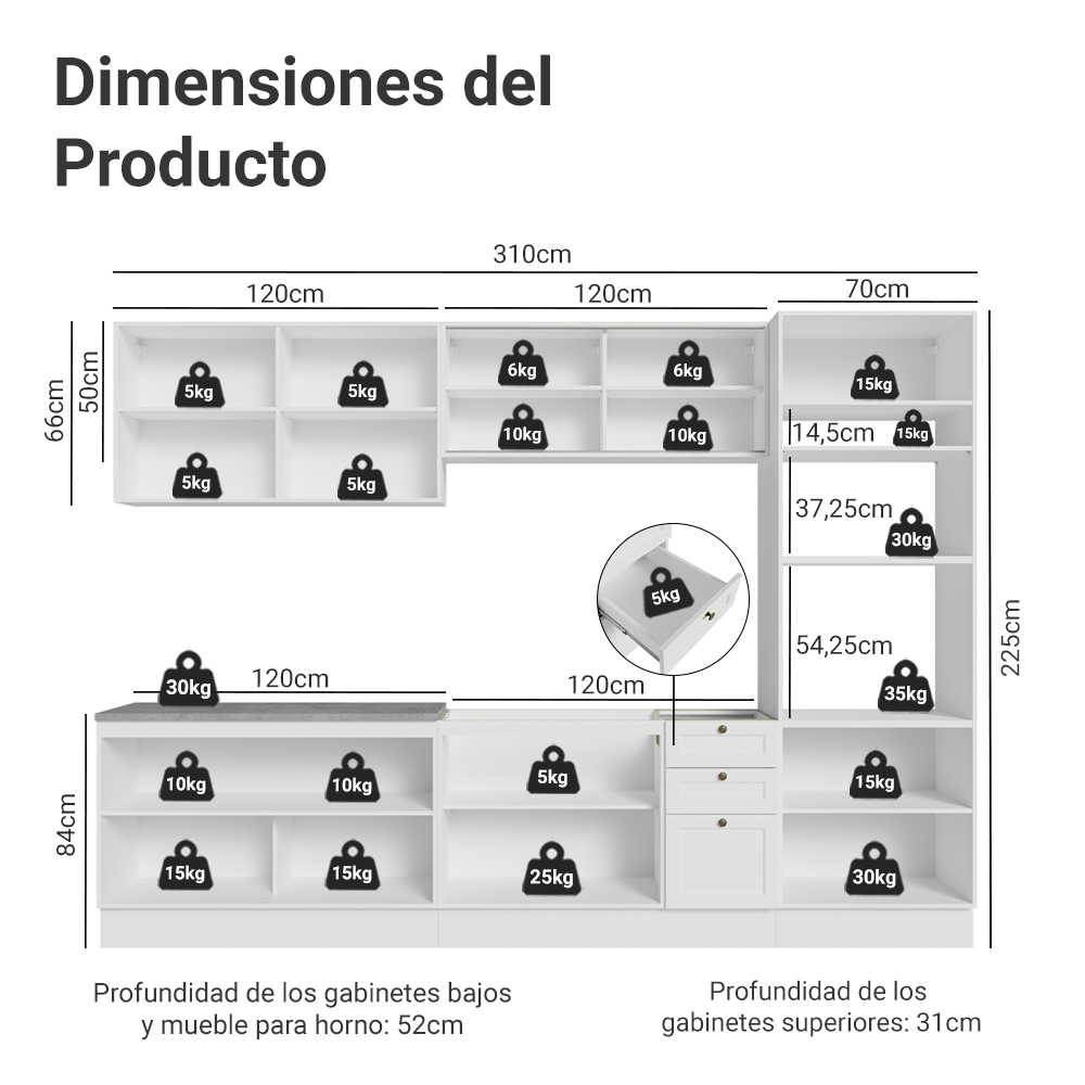 Profundidad: 52 cm (módulos inferiores) 31 cm (aéreos)