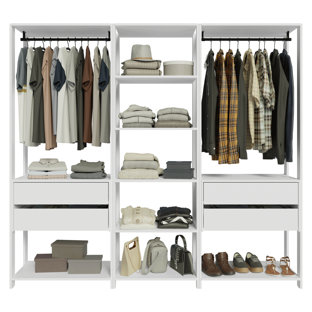 El Clóset modulado Valencia une funcionalidad y un diseño moderno. Compuesto por tres módulos abiertos, ofrece un diseño inteligente que garantiza fácil acceso a la ropa y accesorios, manteniendo todo a mano en el día a día.