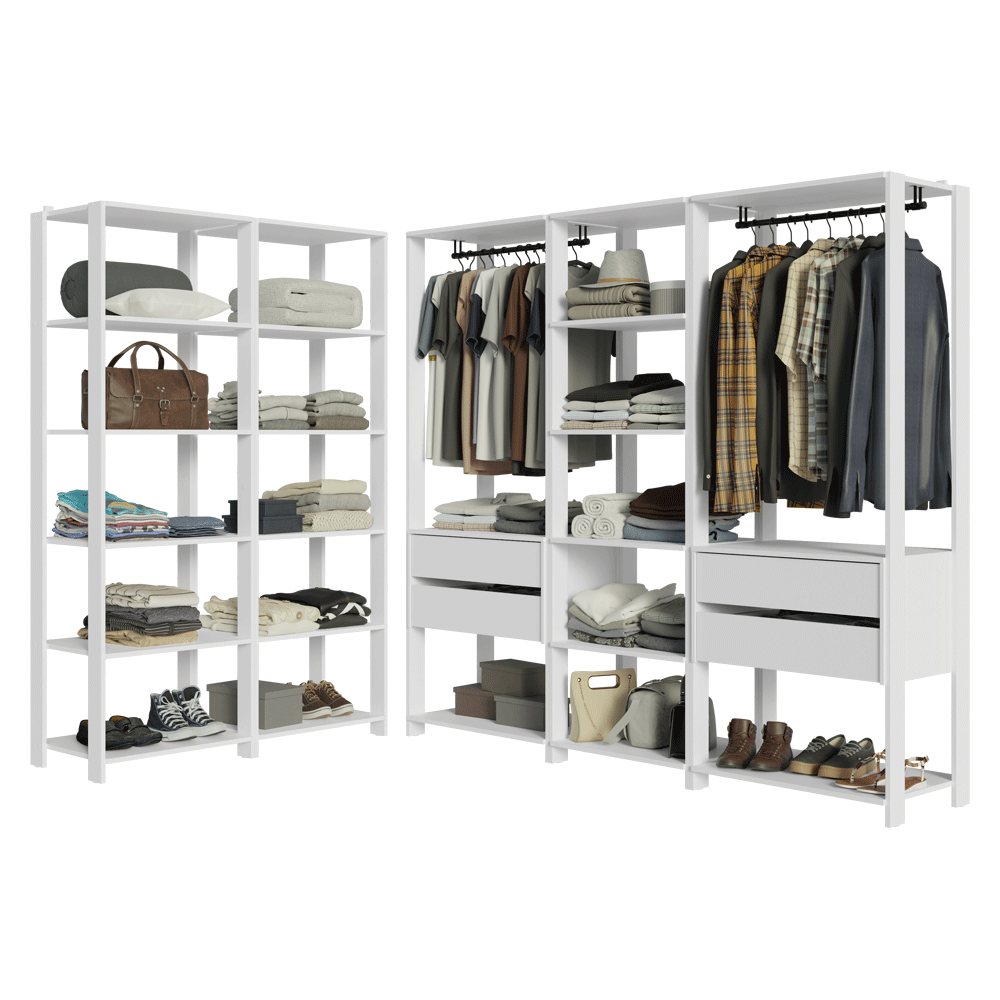 Cada módulo fue diseñado para proporcionar un espacio de almacenamiento organizado, uniendo practicidad y estilo para tu ambiente. Recibirás tres Clósets abiertos de 59 cm de ancho, cada uno con cinco estantes amplios, perfectos para ropa doblada y calzado. Y dos Clósets abiertos de 70 cm de ancho, cada uno con dos cajones espaciosos, ideales para artículos pequeños y accesorios, además de los percheros metálicos.